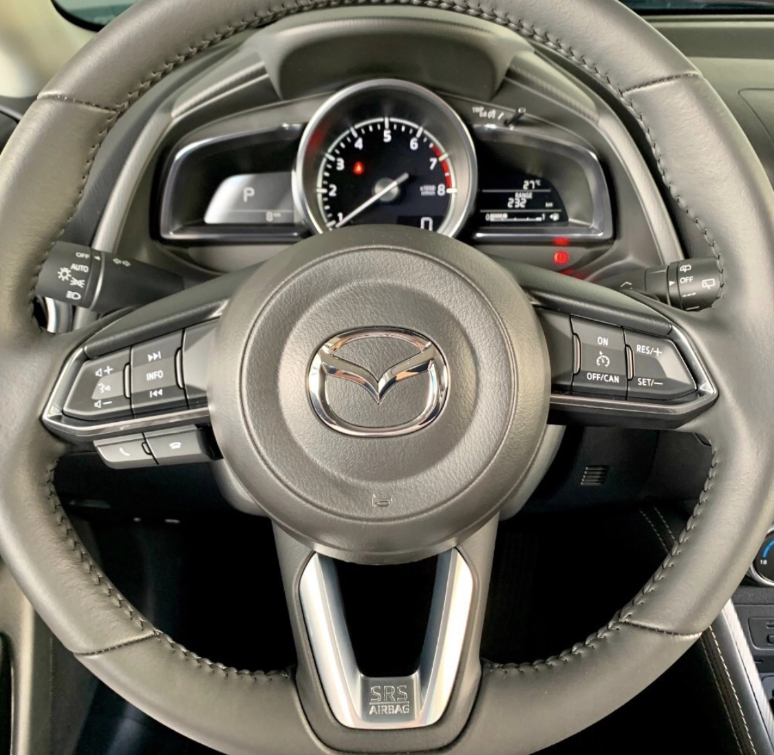 Equipamiento exterior Luces delanteras LED automáticas con sensor de luz y con luces de marcha diurna Espejos retrovisores exteriores color cabina con operación eléctrica desde el lado del conductor y abatibles eléctricamente de forma automática Limpiaparabrisas delantero automático con sensor de lluvia Apertura de baúl eléctrica con pulsador en tapa baúl Limpiaparabrisas trasero Ruedas Rin 16” x 5,5J Aluminio negro Llantas 185/60 R16 86H Llanta de repuesto temporal 165/65 R14 79M Dimensiones y peso Longitud total: 4.070 mm Capacidad de baúl: 220L Peso vacío: 1.073 Kg Mazda Connect Radio CD - MP3/Receptor de AM - FM/USB / Control desde el volante Compatible con Android Auto™ y funcional con equipos móviles iPhone® 6 parlantes Pantalla TFT de 7" Pantalla Activa de conducción a color (HUD) Comandos de voz Bluetooth® Botón Multicomando Antena tipo aleta tiburón Equipamiento interior Aire acondicionado automático Encendido por botón Espejo retrovisor interior día/noche automático Asientos con cuero/vinil-cuero negro Computador de abordo Apertura inteligente de puertas Control de velocidad crucero en el volante Motor Motor SKYACTIV-G 1,5L/16 válvulas/Dual S-VT/Inyección directa Cilindraje: 1.496 CC Relación de compresión 12,0:1 Potencia máxima: 108,6 hp a 6.000 r.p.m Torque máximo: 14,38 kg-m a 4.000 r.p.m Tipo de combustible: Gasolina corriente Transmisión SKYACTIV DRIVE (Automática) de 6 velocidades con selección de modo de conducción Sport y Control de cambios en el volante Skyactiv Chassis Suspensión delantera: independiente tipo McPherson/Barra estabilizadora Suspensión trasera: Barra de torsión/Amortiguadores telescópicos Dirección asistida eléctricamente (EPS), regulación según velocidad del vehículo y r.p.m. del motor Control G-Vectoring Plus (GVC+) Seguridad Activa Sistema de Frenos Antibloqueo (ABS) Distribución Electrónica de Fuerzas de Frenado (EBD) Asistencia de Frenado (BA) Control Dinámico de Estabilidad (DSC) Sistema Control de Tracción (TCS) Seguridad Pasiva 6 airbags (conductor, copiloto, 2 laterales delanteros y 2 de cortina) 6 Anclajes para silla de seguridad niños ISOFIX 5 apoyacabezas ajustables en altura/Diseño que reduce lesiones cervicales 5 cinturones de seguridad con 3 puntos retráctiles e inerciales/Delanteros con pretensores y limitadores de carga Columna de dirección colapsible con ajuste de altura y profundidad Pedal de freno colapsible Seguridad Proactiva i-Activsense Sistema Avanzado de Monitoreo de Punto Ciego (BSM) con Alerta de Tráfico Cruzado Trasero (RCTA) Señal de Frenado de Emergencia (ESS) Asistencia de Arranque en Pendiente (HLA)